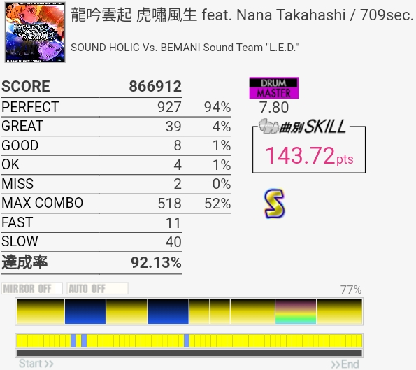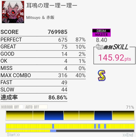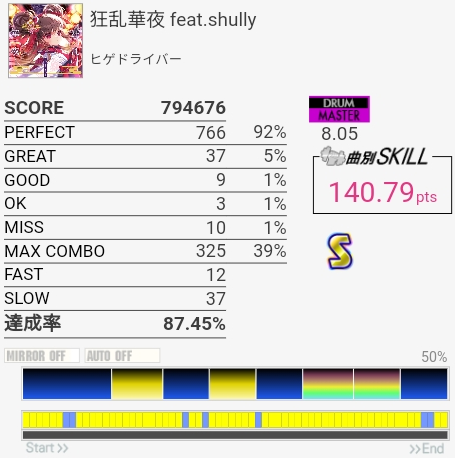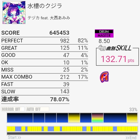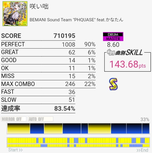 16分HHで4割くらい多重反応するので無理。6フレーズ目のSN×3→HT×3→SN×2→LT×4→LC+SNがなんか叩けん……左手が勝手にLCに向かっちゃう。ちゃんとノーツを見れてないんだろうな。