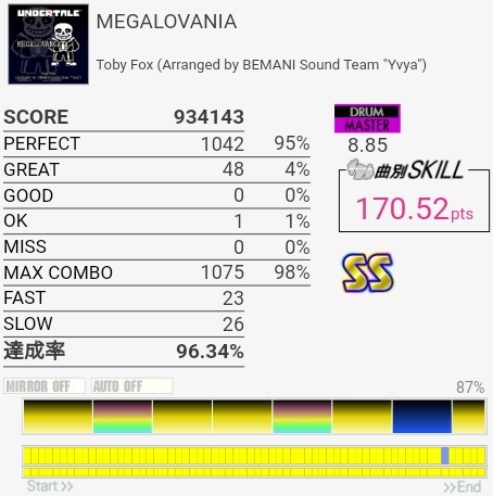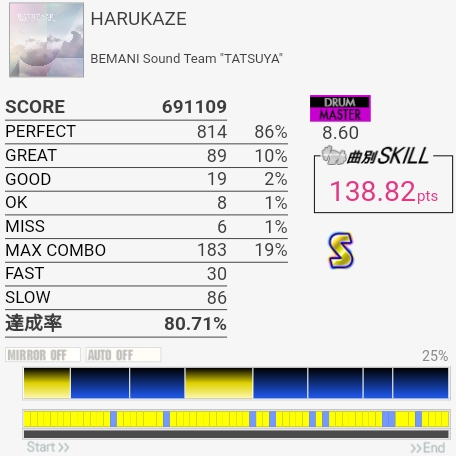 やってて気付いたけど処理落ちによって判定が曲中でズレてるんじゃなくて、目線が下がると判定文字のズレにつられて自分がズレてるんだ。モニタの応答速度とかの問題らしいけど叩くより早く判定文字を出すなんて不可能だしどうにもならないよな……さすがにARENA MODEL全部のモニタを交換とかしないだろうし。というか判定文字に影響されるなんて思ってもみなかったよ。やっぱハイスピ4.50でシャッター上げた方がいいのだろうか(無限ループ)。