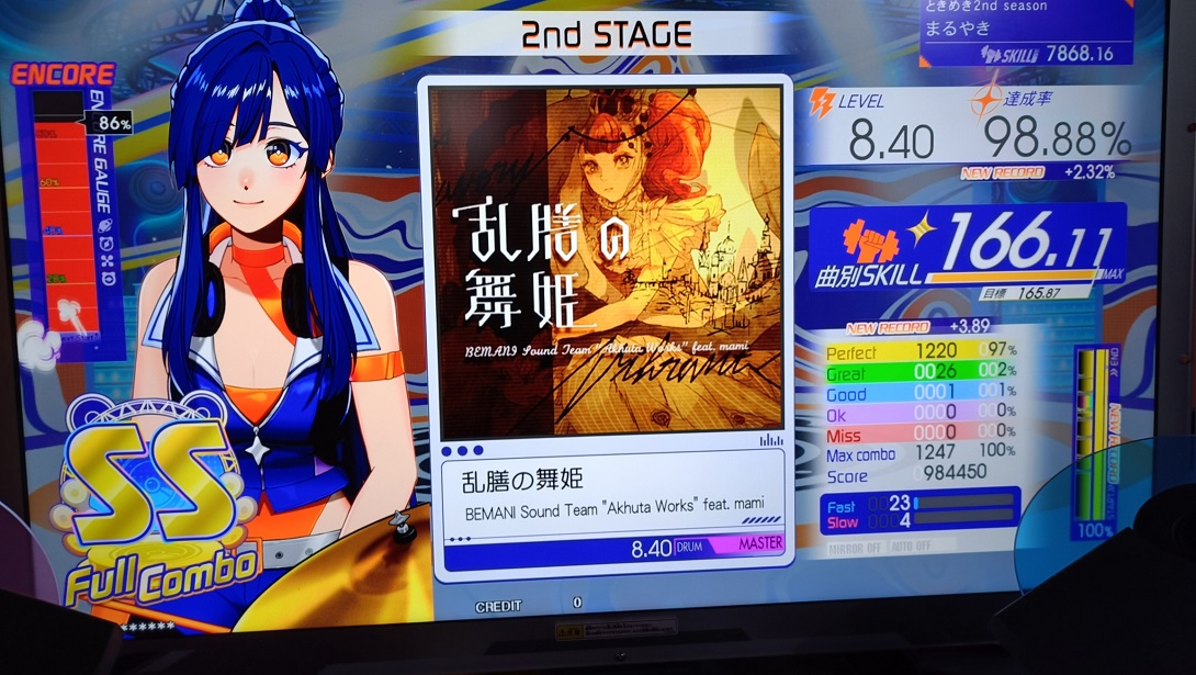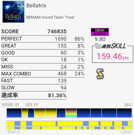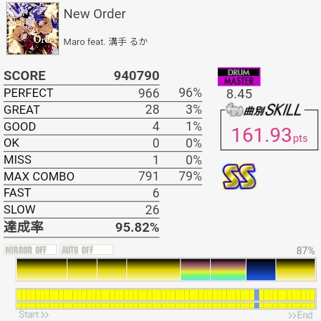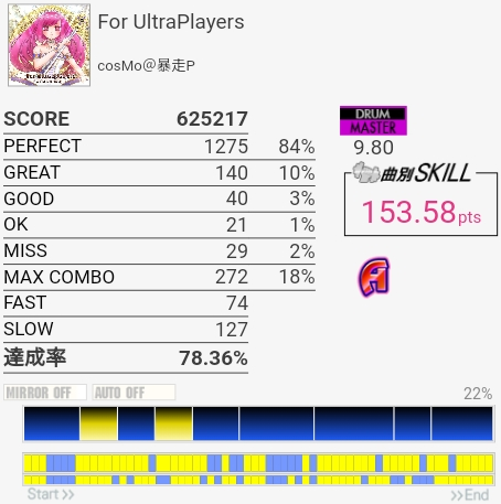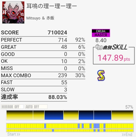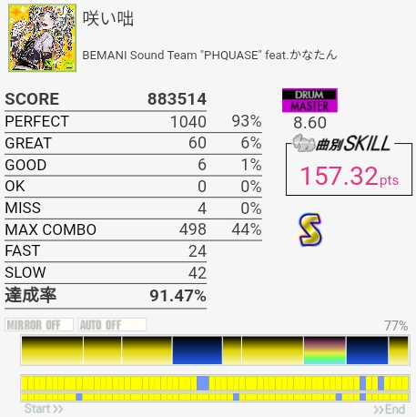 譜面動画でけっこう予習してたんだけど実際速いし叩かせる気がないタム回しが終わってる。多重反応がなければSは取れるか……。