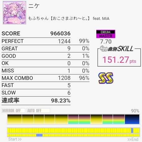 7フレーズ目の16分SN→SN→HT×3のところめっちゃ苦手。毎回忘れる。HHが多重反応しないようにめっちゃ弱く叩くとパフェ率が犠牲になる……。