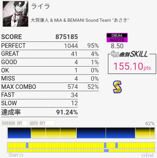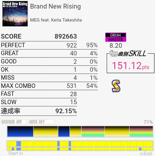 曲カッコいい!上に書いた通り1時間くらい空けてからプレイしたので手が全然動かなかったんだけど、それを抜きにしても最初の16分と3フレーズ目はちょっと叩きづらい。そこゲーだから何回かやれば繋がりそうかな。