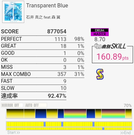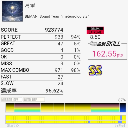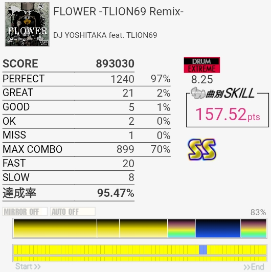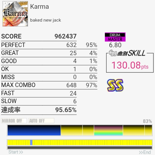 やっとSS取れた!6フレーズ目の3個タムがARENA MODELだとかなり入りやすいので助かった。ラストのSN→タム×2に切り替わるところがマジで見えなくて一回も叩けたことがないけどいっそ全部右入り交互で叩いた方がいいのだろうか。