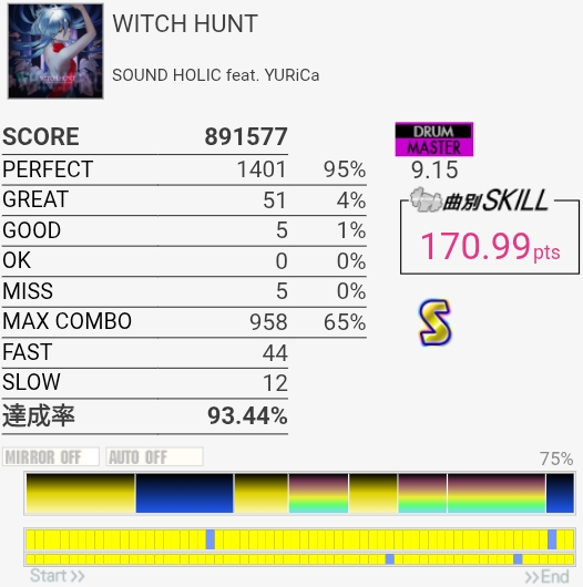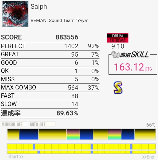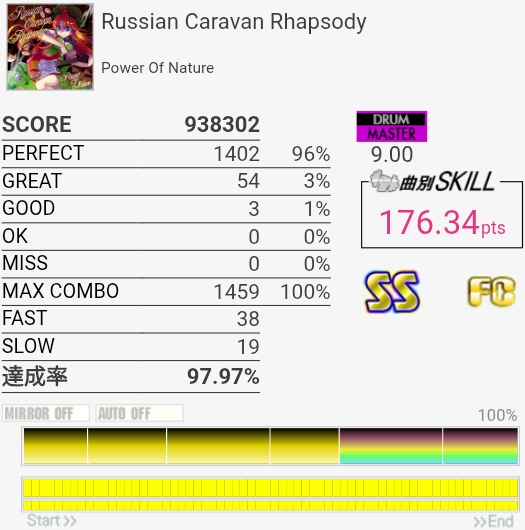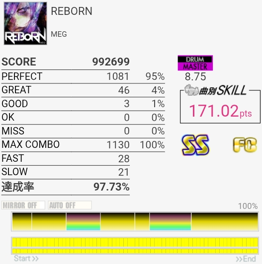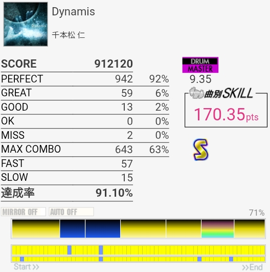 SS取得。やっぱFT→CYから三連符のタム回しが速くてキツい。いつも走り気味でちゃんと叩かないまま次のパッドに移っちゃうのでしっかり叩くことを意識したんだけど外しちゃったな。