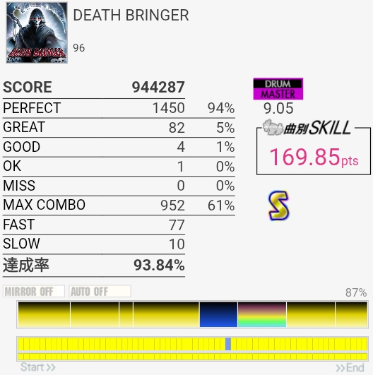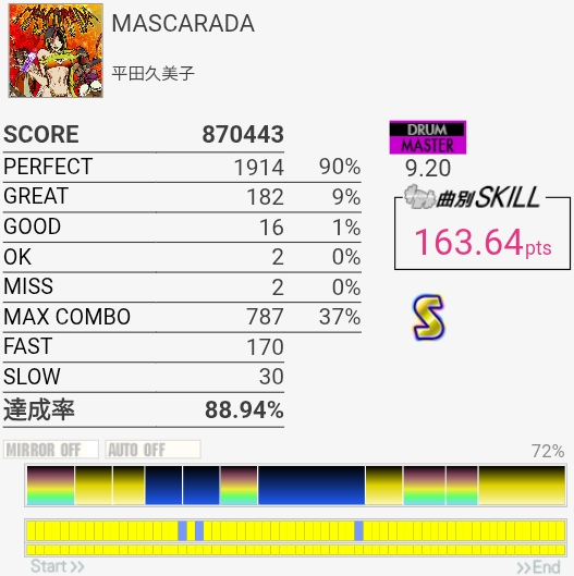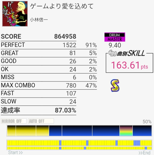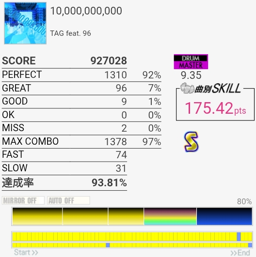 なんでやねん。2フレーズ目終わりのタム回しを取れた時はもらったと思ったんだけど……実際どこでミスったのかよく覚えていない。位置的にやっぱりタム回しだろうか。175点取れたからいいかぁ……。