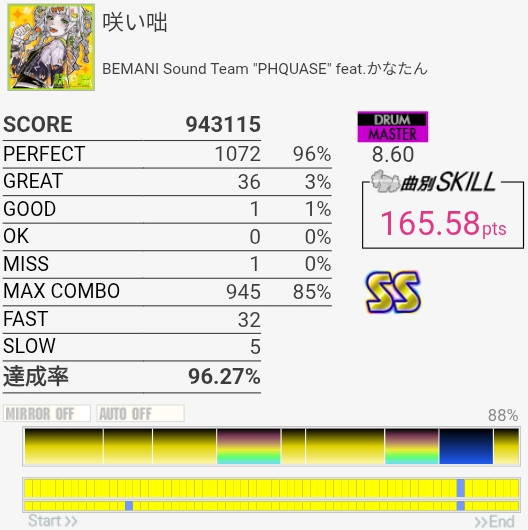 これ前作もこのレベルまで上がってたっけ?これならワンチャン目指してもいいかも。イントロとアウトロ終わりの16分SN→LCの後のところが動きが難しくて取れないのと、真ん中の三連符6連打SN→HT→LT→FTがシンプルに追い付かないのと、サビ終わりのCY→HT×2→SN→タム×2みたいなのをR→LR→L→RRで取るところが叩けないのと。でもこれが繋がるほど手が動くならMASをやるべきかもしれない。