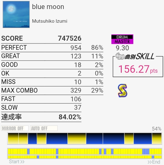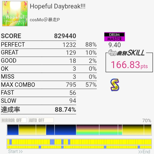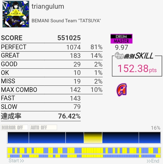 やりたくなったからやったら初フルコンらしい。いつもイントロのSN+LTの後のフィルがよくわかんなくて切ったりAメロのSN連打がよくわかんなくて切ったりしてる。その2か所以外はそんなに難しくないしこのレベルだったら妥当なのかな。