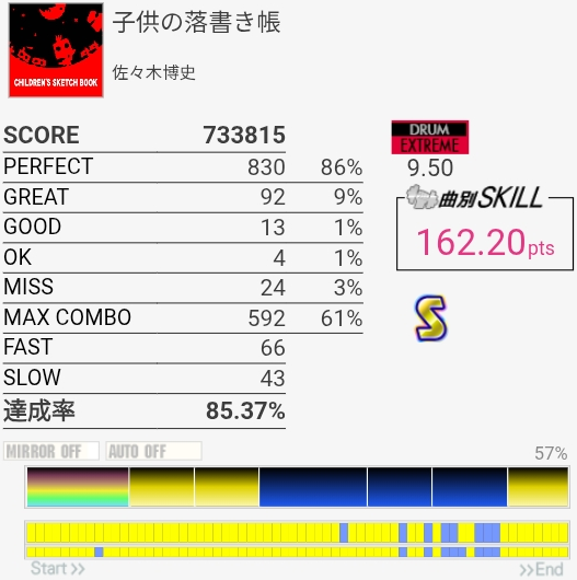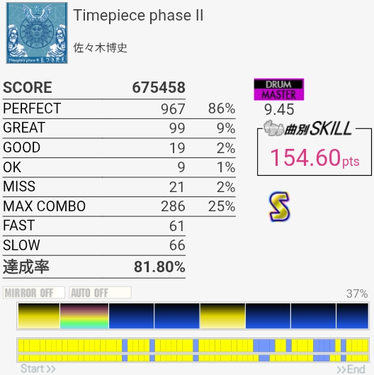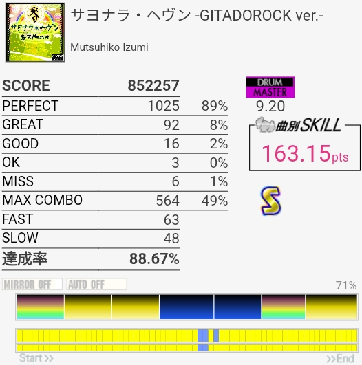 なんでやねん。ブラストの終わり際でシンバルがズレたとかだったと思う。シンバルのパッドもいまいち叩いた感覚に慣れないんだよなあ。たぶん白筐体で力を入れる時はパッドのフチの盛り上がってるところにスティックの腹が当たってたんだと思う。