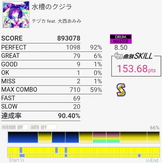 今までで一番ありそうだったけど惜しくも対象入りならず。最初のSN×3→FT×3→SN+CY繋がってるのなんで?やっぱり速い連打で腕が止まっちゃうことが多いので、しっかり叩けるようにならないとな。