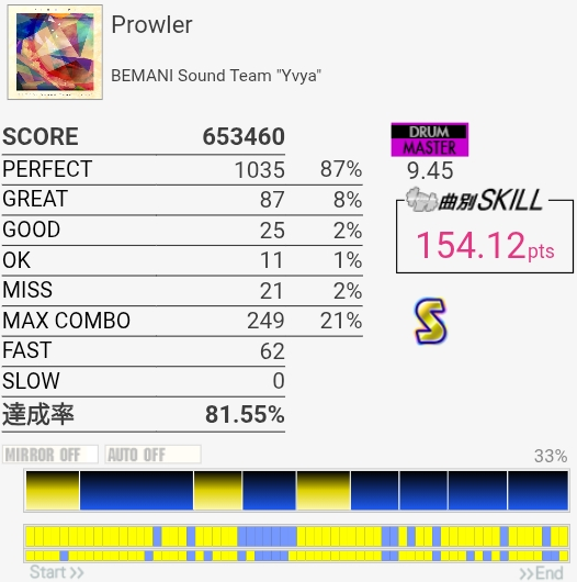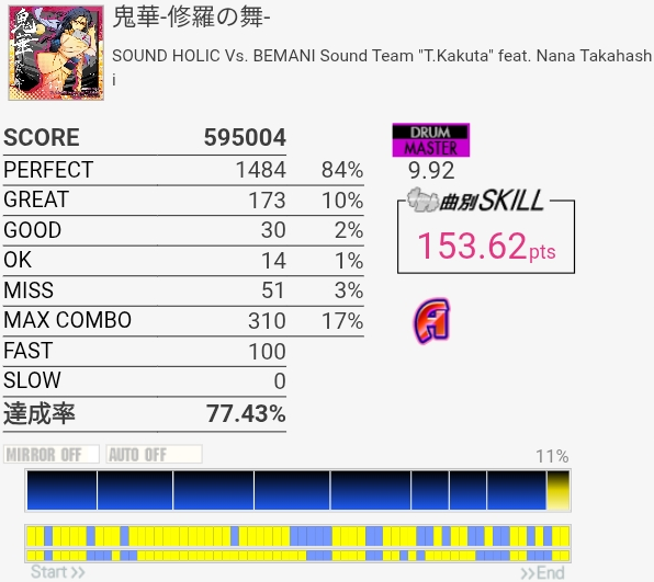 この3か所難しいよな。2フレーズ目はSN詰まりすぎだし5フレーズ目のフィルはなんか絶対1打抜けてしまう。揃わないことはなさそうな感触なんだけどなあ。