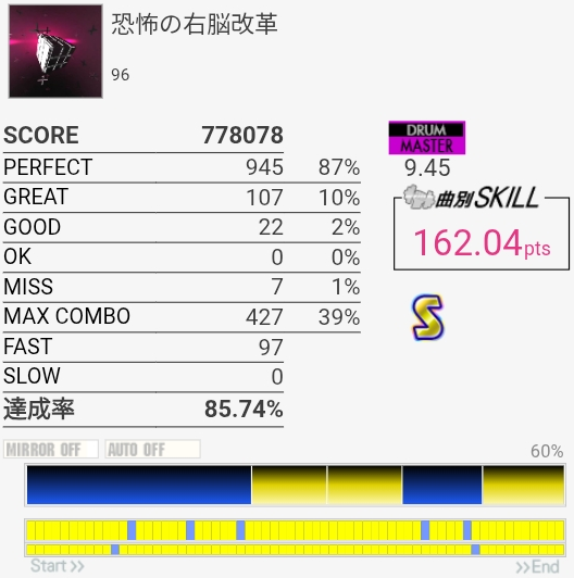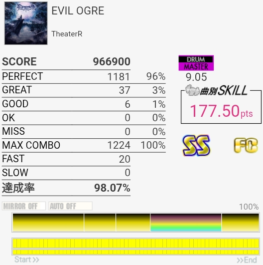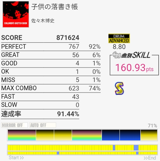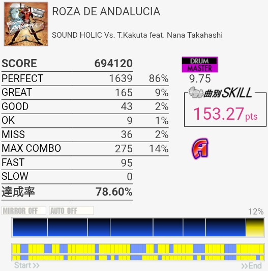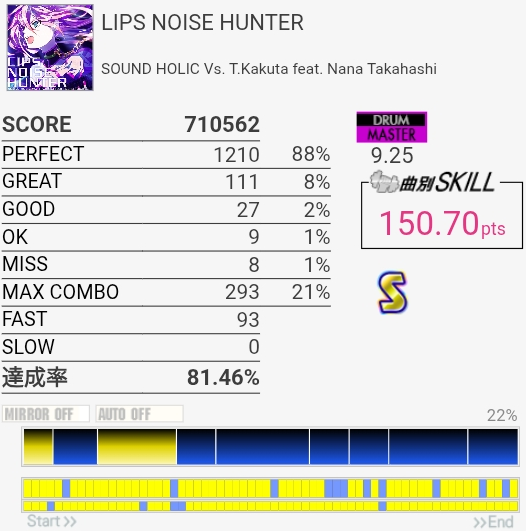 譜面見た時に予想してたけどシンバルタム同時のところの癖つき具合がヤバい。一番の難所は最終フレーズ入りのLT×3→LC+SN連打だろうな。これを少し粘着したおかげでその後感覚が狂ってしまった気がする。どうでもいいけどプレー履歴でSLOW数が表示されなくなっている。