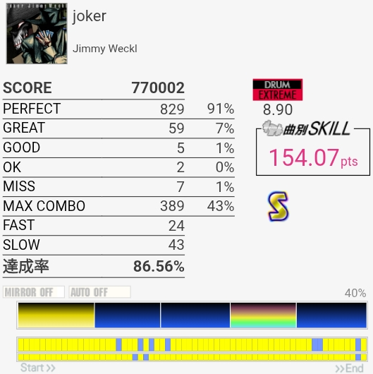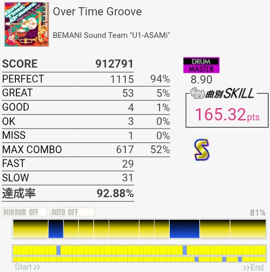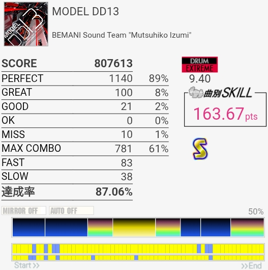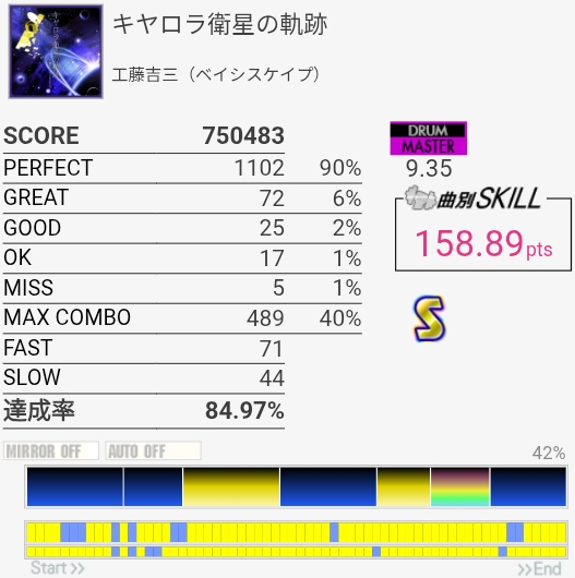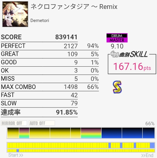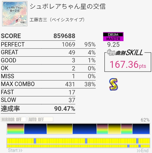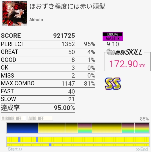 SS取得!2フレーズ目は前にHHとSNの絡みが~とか書いてたけど、絡んでるのLTだったわ。直前のHHと記憶が混ざるほどに譜面をちゃんと見ていなかったらしい。LT→左手SNダブルを2回やればよかった。調子よくないとイントロが叩けないのと、5フレーズ目終わりのなんかいっぱい叩くところでSNが抜けがちだからフルコンはどうかな~対象入れたいな。
