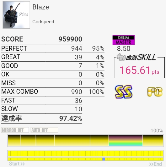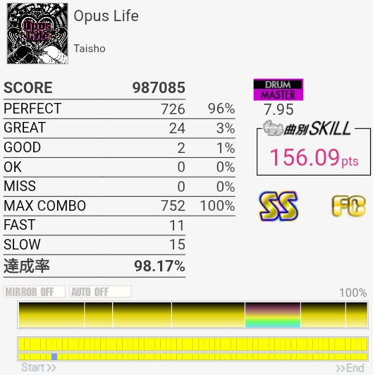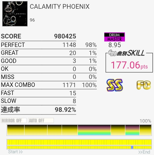 SS取得。1か所SNを叩ききれなかった。曲を通して正解の叩き方がわからないのでHH地帯はRLL→RLLで叩いてあとはゴリ押した。