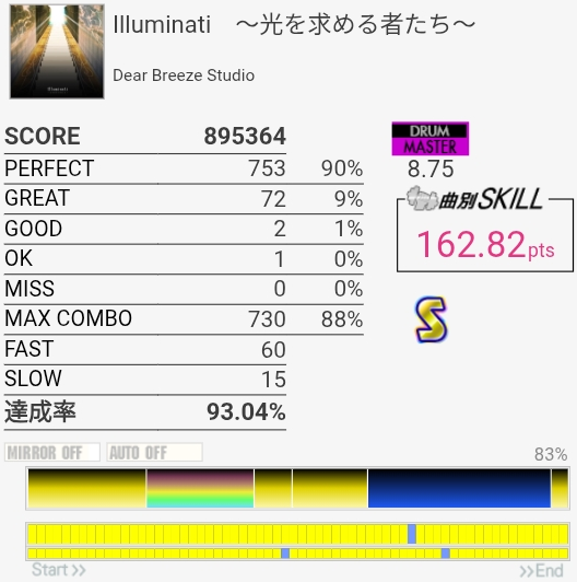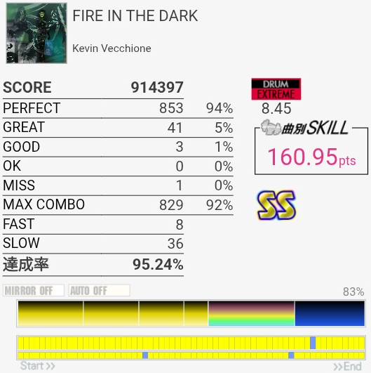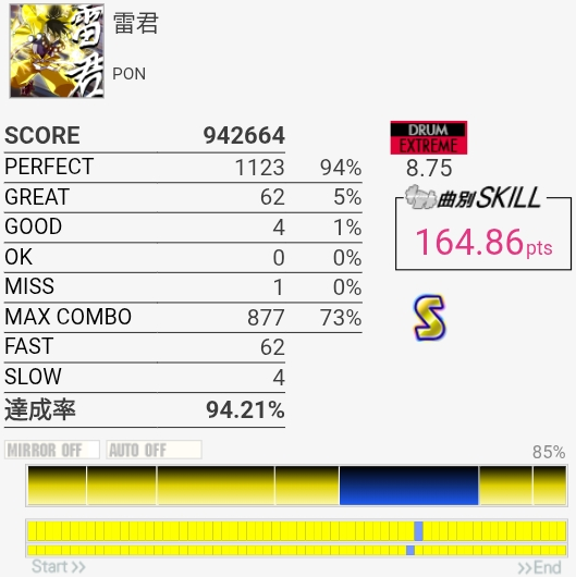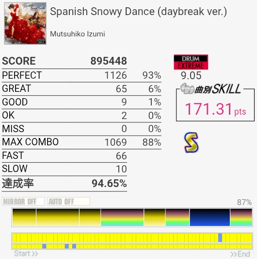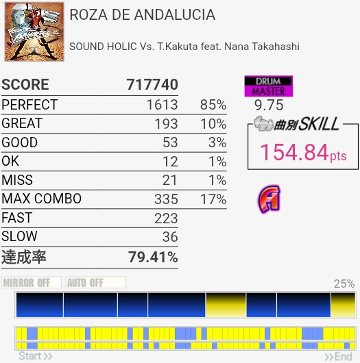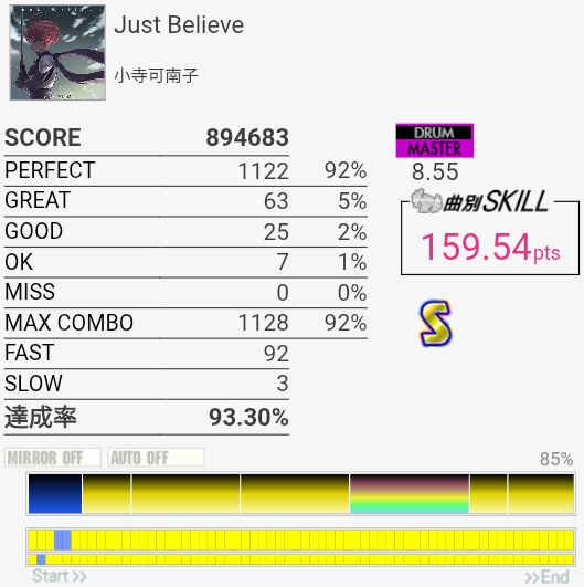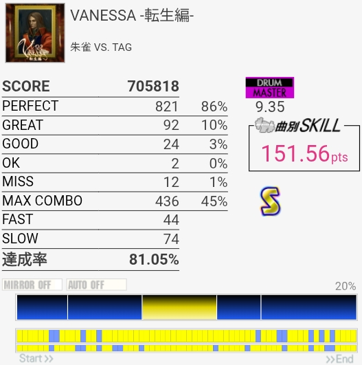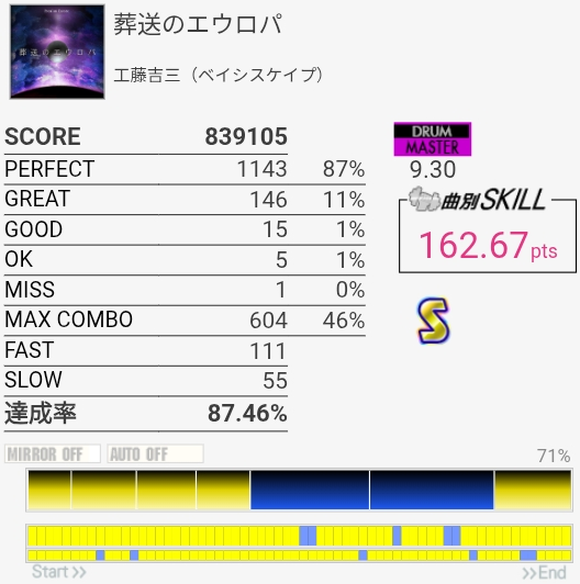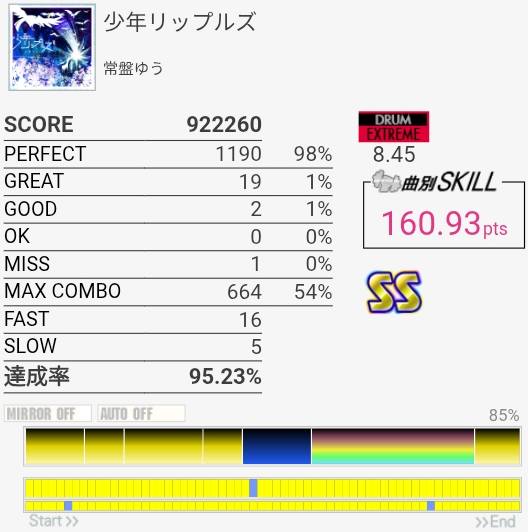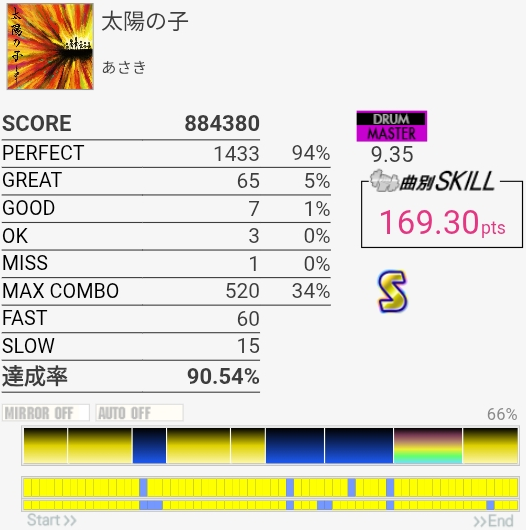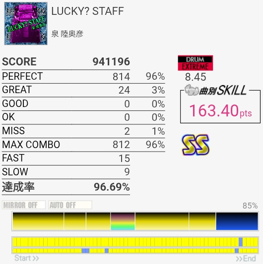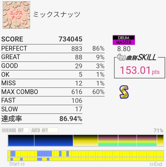 パフェ率はともかくけっこう惜しい感じがする。ペダルがふにゃふにゃすぎて連バスを踏むのがしんどい……。