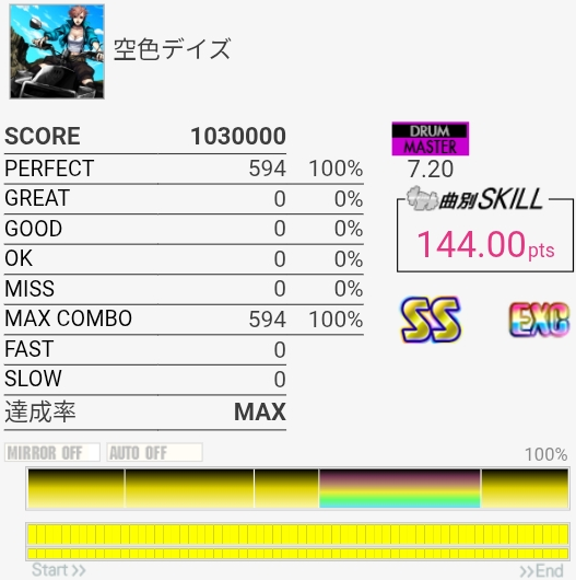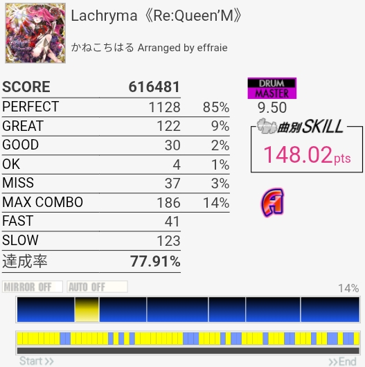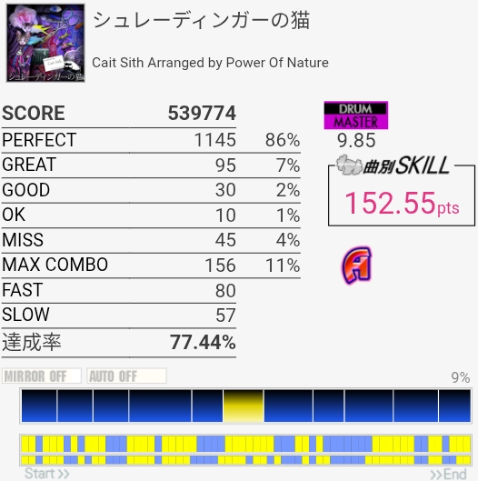 PONの高難易度譜面はどうしてこうなるのか。開幕から意味わからん速さの連打が来るし片手連打やPON特有の叩きづらい配置が多くてこのBPMでやらせる動きじゃないと思うんですけど。LC+SN→HT→LT→LC+SN→HT→LTの繰り返しとかどう叩くのあれ。フレーズをどうにか繋げばSは乗るんだろうけど1回やるだけで腕が辛いのでしばらくはいいか……。他の4曲は素直な譜面だといいなあ。というか5曲解禁したら大ボス曲とか出てくるのかな?