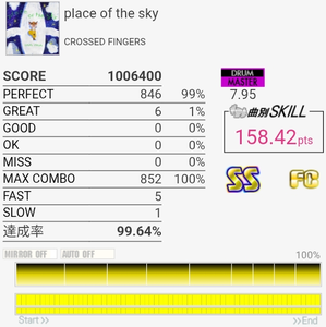 月曜日にもプレイしてたんだけど、ノーツ表示と判定ラインをいじりまくってたら完全に判定がわからなくなって終わったと思った……いじる前の設定を撮っておいてよかった。というか予告なしにリセットされたせいで前の判定ラインがどのくらいだったか覚えてないんだよな。ノーツに対して判定を早めただけだったらリセットせずに「ノーツ表示をマイナス方向に調整してください」でよかったじゃん。