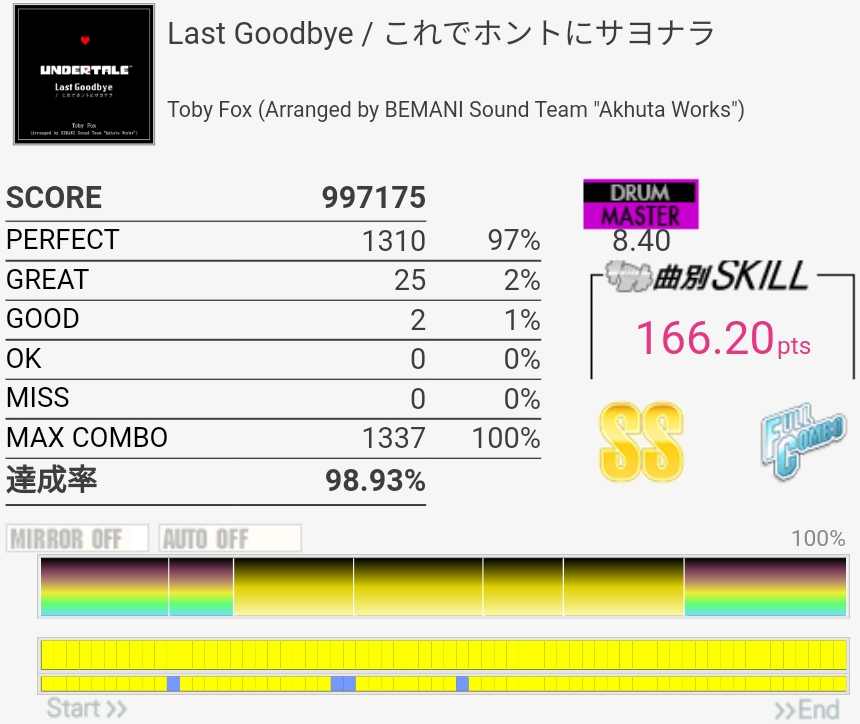難度値はおいておいて、譜面自体意地が悪いというかいちいち左右に振り回すのでキッツいっすね。三連譜ツーバスのところを取れればS判定は出そうだけど……このBPMを捌くのってもはや才能の世界な気がしちゃうなあ。