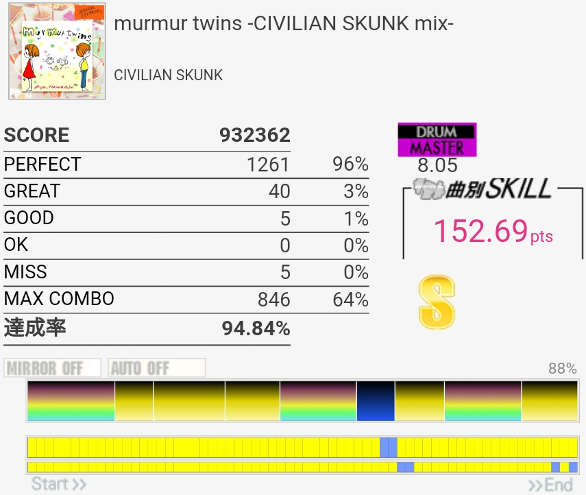 2フレーズ目の見づらいタム回しと4フレーズ目のSN×4→LT×2→FT×2→LCと、5フレーズ目のHT×2→LT→FT→LT×2と、6フレーズ目のLT→FT→HT→LTの2-2-2-2(一番ムズい)と切りやすいところが多いので伸ばすのつらそう。なんかやたら刻みがズレるし体力的にも回数できないからつらい。
