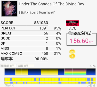 この人の高難易度譜面って交互で叩ける部分多いけど振り回されるし速いからそんな良心的とも言えないんだよな。全体的に窮屈、というのは9台後半狙って作ったらしいからそうなるか。あと変拍子にする必要ある?って思っちゃったので個人的にできるようになりたいとは思わない曲。もっとうまくなったら違うのかな~。