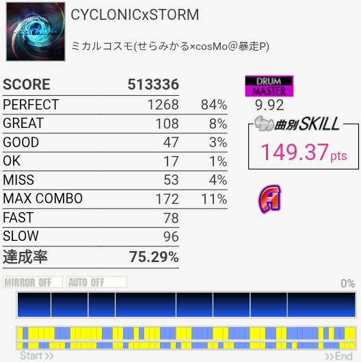 序盤のCY刻みでリズムを間違えて2個。32分入りのSNとかめっちゃうまかったんだけどなあ。