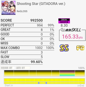 もっと気持ちいい譜面にしてくれてもよくない?4フレーズ目にdouble thrashを難しくしたみたいなパターンが降ってきて8.30はマズすぎる。繰り返しでパターン違うし。どうせダブルで処理するでしょって感じかもだけどちゃんとシングルで回したぞ。