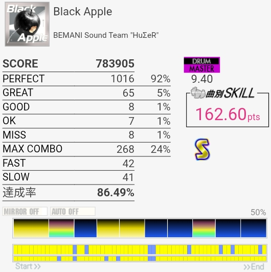 パフェ率終わりすぎ!たぶん前半の左手でHHを叩くところが全部GOODだった。