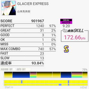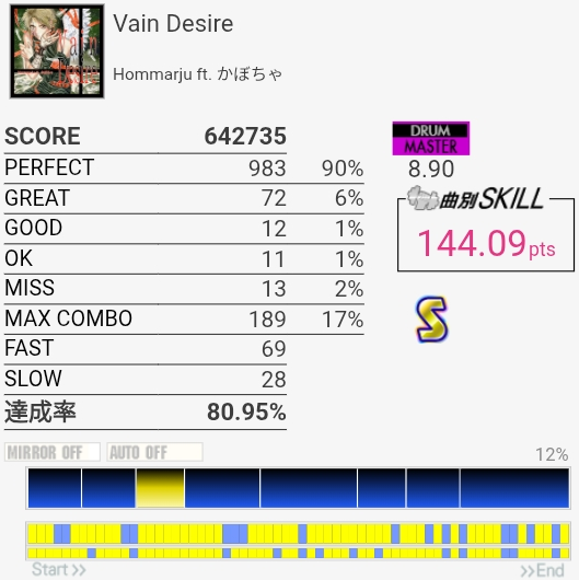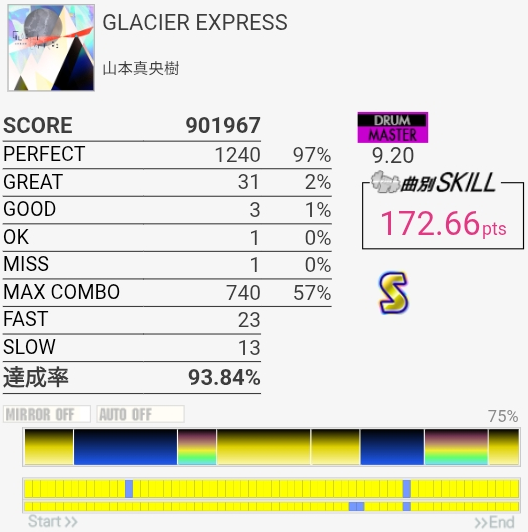 最初と最後をバッチリ叩けたのにサビでHHを打ち損じちゃってすごくもったいなかった。サビのツーバス地帯も何気にミスしやすいんだよなあ。