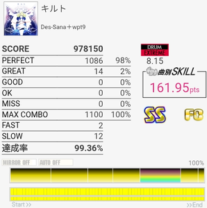 以前はデデッデデッデデッデデッのところの左右振りがめっちゃ苦手だったんだけどさすがにできるようになってた。サビ終盤でグレ量産してしまった……。