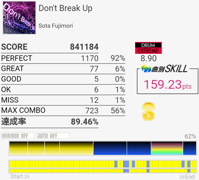 初見で170点取れる譜面……と思ったら初見が一番上手かった。Aメロ2のタム回し→FT×2→SN+CYだったかが一番の切りどころかな?個人的にはラストに癖がついて右手がどっかいっちゃうようになってしまったり16分SN連打→FTがわりと追いつかなかったりする。2-2-2-2は思ったより叩ける感じでよかった。