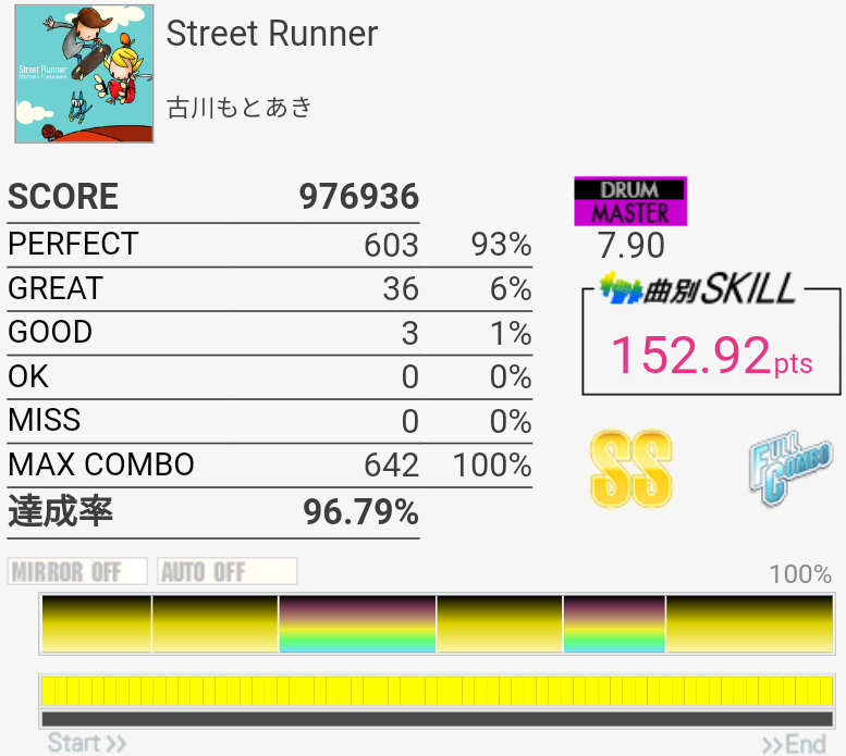 ギタドラシカとtrianglum部分が繋がってちょい伸び、惜しくも170点ならず。3フレーズ目が叩けていればな。