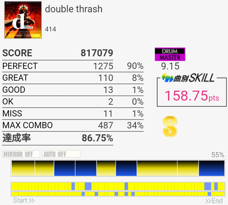 お前急に入ってきたな!?170点8曲目。タム部分の1パターン目はHT→LT→FTをLRLで取ってて、それでギリギリ次も叩けてたのでまあそれでいいのだと思う。3パターン目で崩れちゃって出口の16分も叩けん。なんとなくやるかーって感じで選曲したので170点取れててびっくりした……最近IIDXをがんばってるおかげで譜面認識力が上がっているのかもしれない。3フレーズ目終わりのFT×3だったかを反応させられなかったのがもったいないなー。