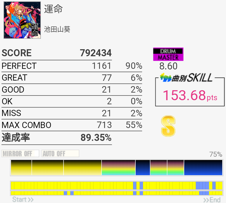 ラストが強烈……配置的にそこまで鬼畜ってわけでもなさそうだけれど、このゲームのシステムだとあんまり好ましくはない譜面だよね。5フレーズ目のLP踏みながらの左入り連発も結構キツい。LT→FTの表裏もわかんなかった。