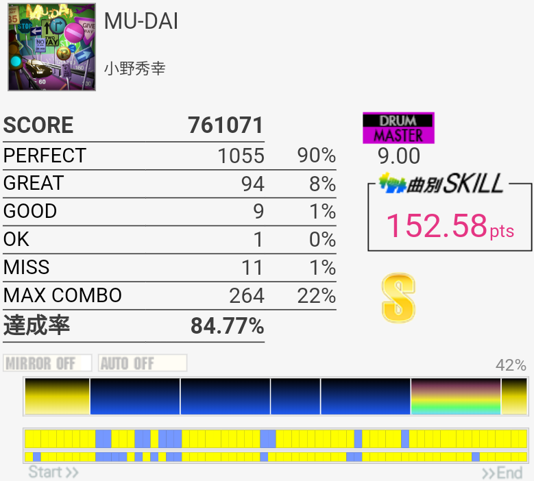 EXTはラストの4個部分でGREATが出てしまった……MASは複色部分は比較的流れでスライドできる感じなのであんまり苦にならない。16分の運指は無理。