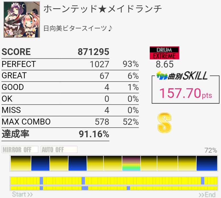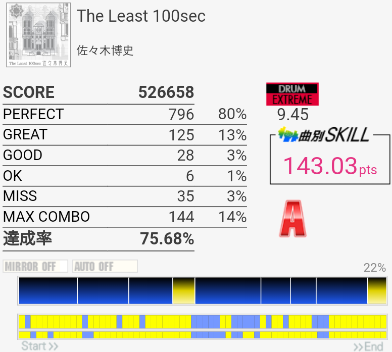 170点9曲目。3フレーズ目のdkdkはSNが8分裏なせいなのかよくズレてしまう……パフェ率が比較的よさげだったのでもったいなかったな。2-2-2-2は完璧に叩けた。