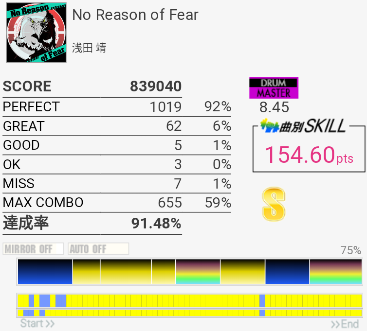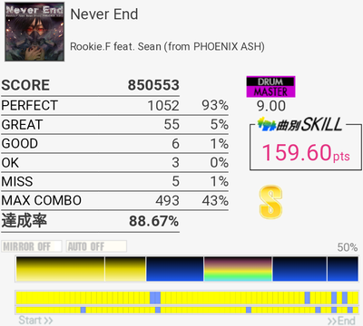 HH×2の二打目が抜けた。ちゃんと叩いたと思うんだけどなー。SNもタムも頻繁にアレって思う時があるし、いまいちホームの筐体が信用できないけど自分もちゃんと芯を捉えられていないのでなんとも言えない。