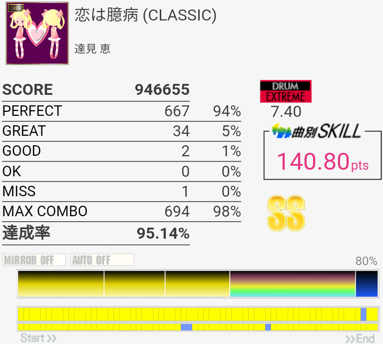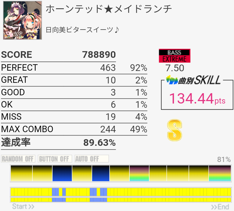 疲れて朦朧としている中なんかこの曲をやっているときだけ譜面が若干スローに見えて体もよく動いた。そういうのはもっと難しい曲の時に来てくれ。