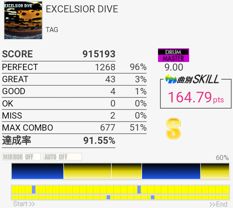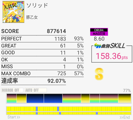 全然やってないぶんちょい伸び。4フレーズ目のクソ速SN×3地帯以外は叩けるらしい。刻みでミスっちゃうのはダサい。