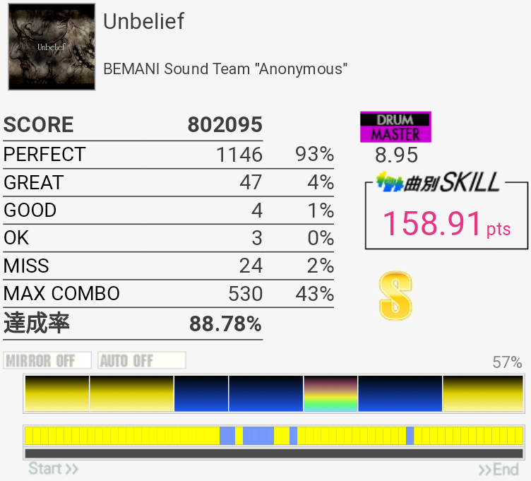 まさかのSS取得。イントロの追い越しタムは叩けてない気がしたのに繋がったからよくわかんなかった。多重反応?サビ前のFTからのSNフラムは左手ダブルでゴリ押した。ラスト切っちゃったのは残念だけど右腕ギリギリだったしSS乗ったからいいかな。