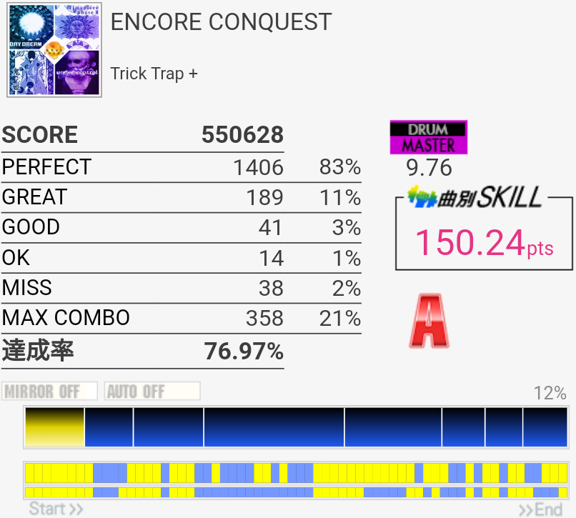 B判定→A判定。譜面忘れてたのでもしかしたらデイドリ以外いけたりしない?とか勘違いして選曲した。エグいね!
