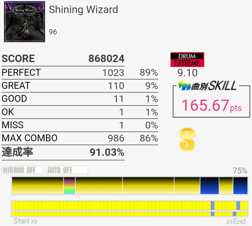 譜面忘れてたのでどんなんだったっけ?って思って選曲した。エグいね!最後らへん腕が動かなくなってて普通に落ちかけた。