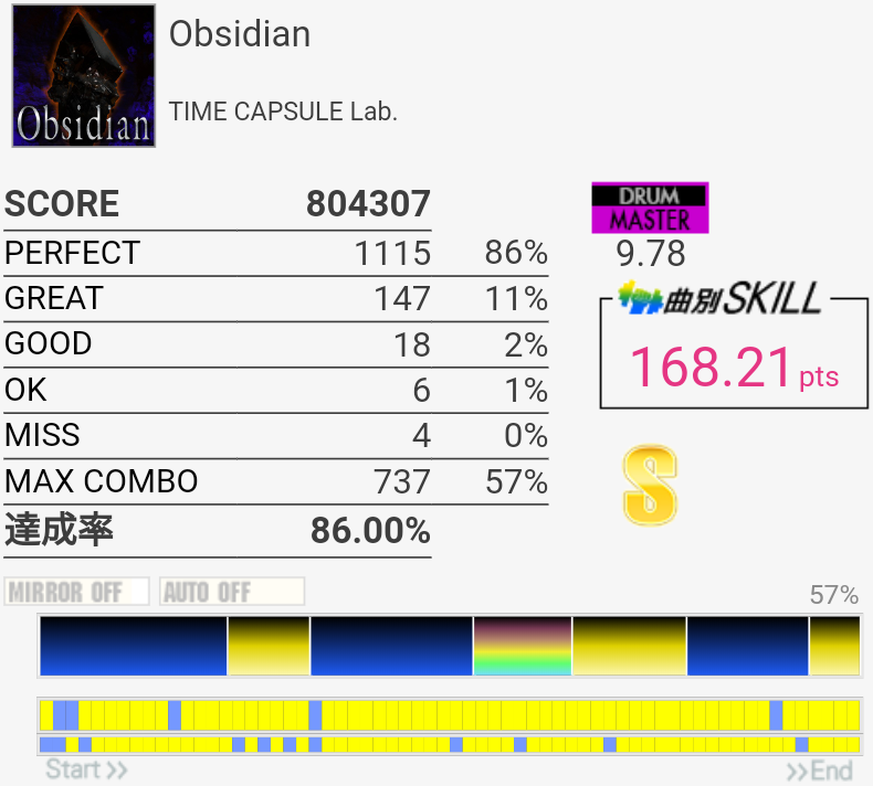 S取得&対象入り……!マジで?3フレーズ目の入りと最後のツーバスでCYが多重反応しなければって思っちゃうけどまあ、まあ。2フレーズ目のHHを左手で全部叩けたのが強い。