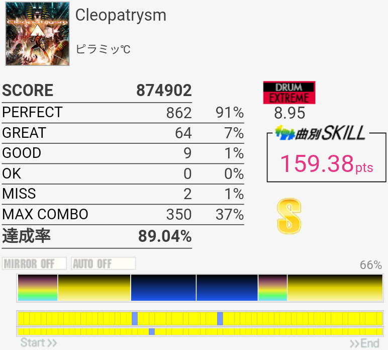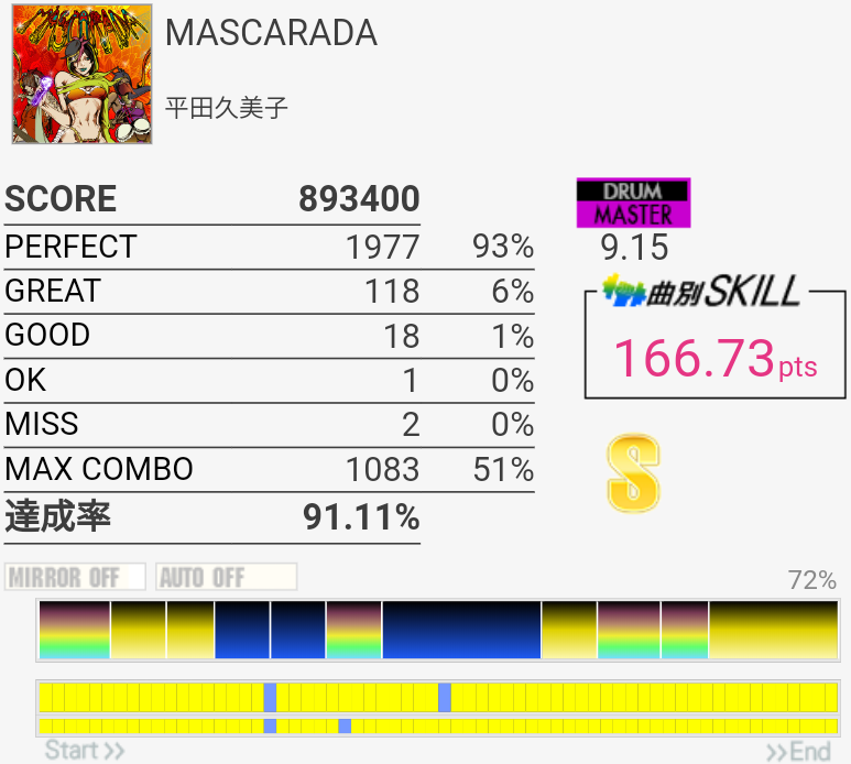 2フレーズ目の最初でCY多重反応した。どうせその後ミスってるしパフェ率お通夜だけど。ラストのSN×4→LT×2→FT×2がどうも苦手でLTにちゃんと手が伸びない。直後のHH+SNを意識しすぎてるのか、直前のCYからちゃんと戻れていないのか。