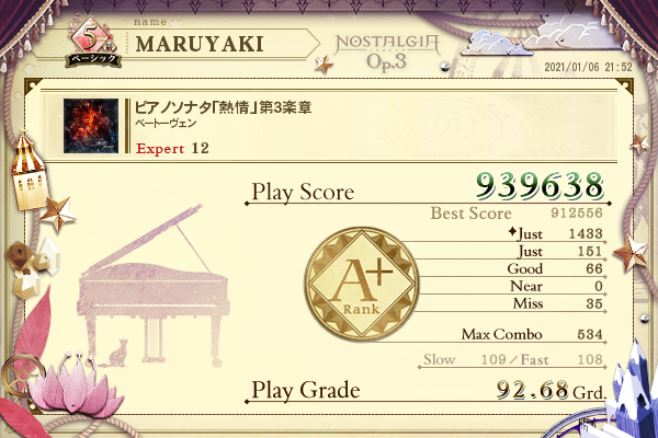 クラシックのLv.12とReal2をやってたら思った以上にリサイタルGradeを稼げたので他のジャンルで最近やってない譜面をさらう感じでプレイした。どのくらい伸びたかというと……。