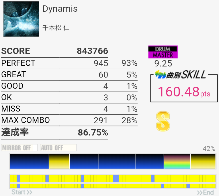 なんかこの曲やってる時だけやたら譜面の解像度というか見え方が違ってて、譜面を見てから体を動かすまでのタイムラグもなんだか短いような、そんな感じだった(HH地帯でめっちゃ崩れたけど)。ラスト繋がったの初めてだし、この感覚をものにできればスキル10くらい伸びる気がするな。IIDXやってる時の感じが近かったかな?それとも目線の位置がちょっと高かったかな?