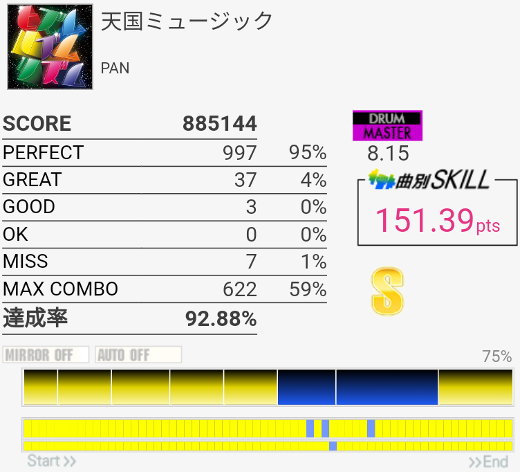 この曲の8分LPの感覚がどうもズレてて、8分裏のつもりで踏んでると比較的踏めてた気がする。よくわからん。