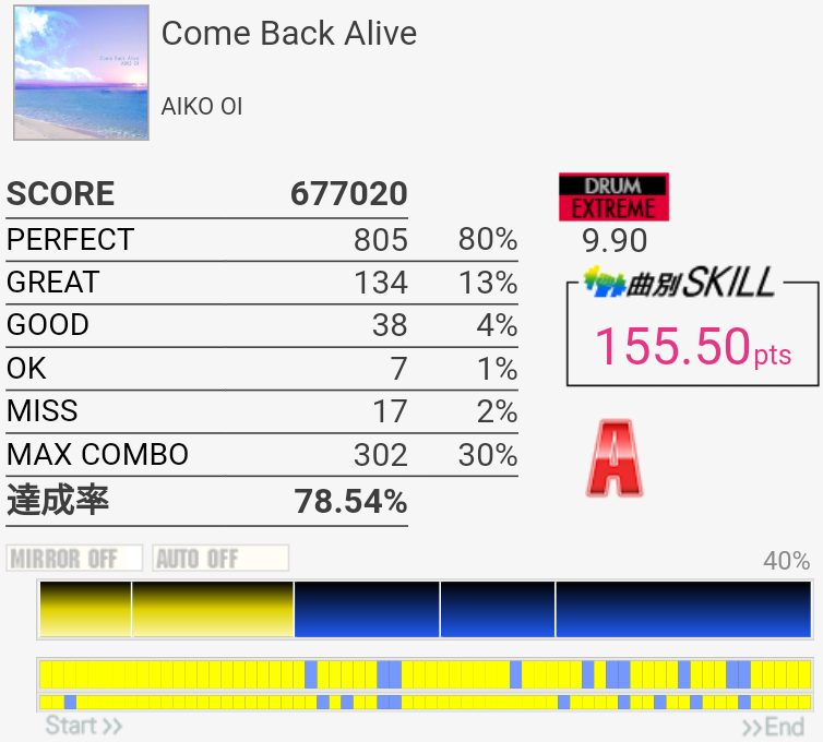 0.8%伸びた。ツーバス後半の入り方間違えて無理やり繋いだのでそれがなければ98%乗ってたかなあ。