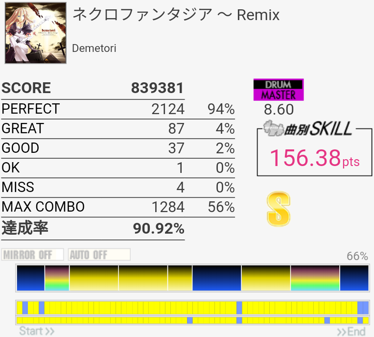パフェ率がヤバい。序盤の左手でHH叩いてタム叩くところのリズムがよくわかってなくて毎回全部GREAT以下になるのでヤバい。