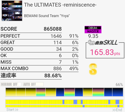 SS取得。最初以外あんまり覚えてなかったけどなんか叩けた。クソ速SN連打が2回とも繋がったの奇跡的だね!最初のBP踏めなかったけどGOOD出てないし満足。この曲初出の難度値がおかしかっただけで実は良曲良譜面なのでは……?