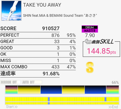 初見でめっちゃ混乱した。曲オシャレだし譜面楽しいね!毎回切る部分が2か所あって、一個目は3フレーズ目の三連符SN→SN×4→LT×4→FT×2でここがクソ速い。Yvyaの譜面はいつもそうだ。二個目は4フレーズ目終わりのHT×2→SN→LT×2→SN→FT×2のところ、これはたぶんタムをダブルで取るんだろうけどHTダブルが超苦手なのでRLL→RRL→RRで取ろうとして8割切ってる。