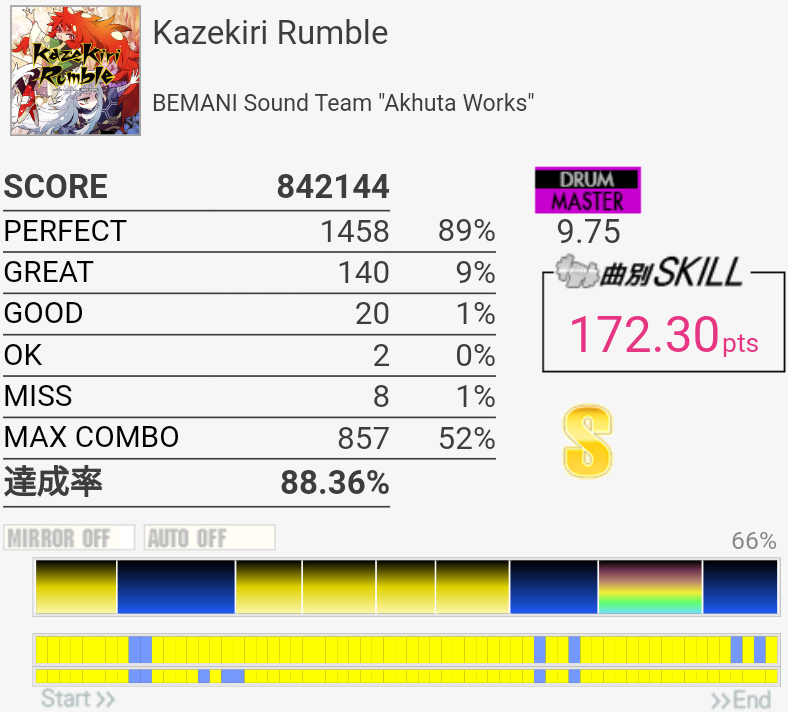 前半は右手8分を叩きながらの8分ツーバスがすごい苦手。あと嫌がらせのように16分連打が挟まるのも嫌い。この譜面に対して解禁がノルマが少ないRANDOMチャレンジなのは温情なのだろうか……。