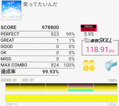 SS取得。後半の1小節ツーバスがズレちゃったのがなー。3フレーズ目はもう諦めた。